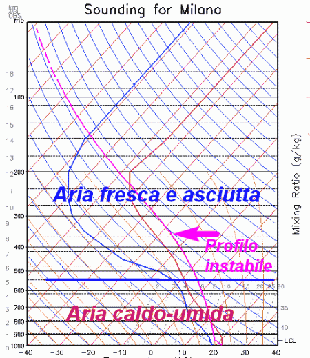 Ma l’aria secca è più pesante dell’aria umida, pertanto la colonna d’aria inizia a divenire instabile. La situazione è molto frequente soprattutto sulla val Padana, catino semichiuso che favorisce l’accumulo di umidità nei bassi strati. I Padani conoscono bene questa situazione che va sotto il nome di "afa".
