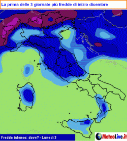 Come potete consultare voi stessi attraverso le nostre mappe del freddo, aggiornate diverse volte al giorno meteolive.leonardo.it/speciali/MAPPE/73/Freddo-intenso-dove-e-quando-/35146/, gli scarti maggiori, e quindi le giornate più fredde, attesi lunedì 3 dicembre ( 5-6°C sotto media), domenica 9 dicembre (7-8°C sotto la media) e martedì 11 dicembre (fino a 10°C sotto le medie).