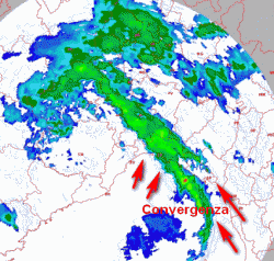 Sulla parte destra della linea piovosa soffia un tiepido Scirocco. Sulla parte sinistra è invece presente aria piu fredda e secca, che arriva mediamente da sud ovest.