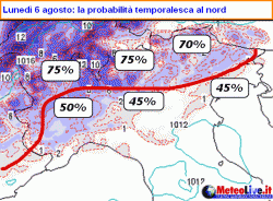La valle Padana invece necessita di una marcia in più, solitamente affidata al transito di masse d’aria più fresche alle quote superiori, a sorvolare il catino caldo e afoso giacente al suolo. Tra venerdì 3 e lunedì 6 ci troveremo proprio in questa situazione: aria instabile tenderà a lambire l’arco alpino e alcuni refoli potranno sfuggire al di qua delle linee di cresta, attivando qualche improvviso spunto temporalesco anche sulle accaldate zone padane. Lunedì 6 sarà la giornata più propensa ad eventuali fenomeni.