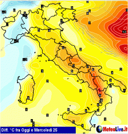 La mappa in figura si riferisce agli scarti termici tra la giornata odierna, giovedì 19 aprile, e quella di mercoledì 25 aprile. Per una visionata completa delle mappe relative all’intera settimana potete consultare il seguente indirizzo https://www.meteolive.it/speciali/MAPPE/73/Differenze-di-temperatura-al-suolo-dei-prossimi-giorni-rispetto-ad-oggi/32852/ .