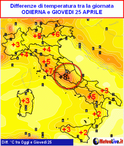 A tale scopo, vi mostriamo la cartina con le differenze tra le temperature che si registreranno oggi e quelle attese per la giornata di giovedì 25 aprile.
