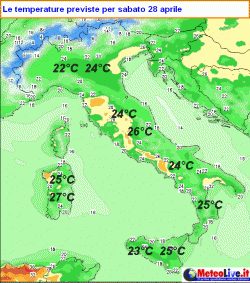 Le temperature sono previste aumentare tra il 25 e il 28 aprile fino a portarsi ovunque al di sopra delle medie stagionali. Sabato 28 sarà la giornata più calda. Non sono comunque previsti eccessi.