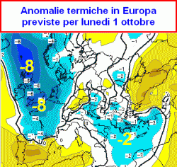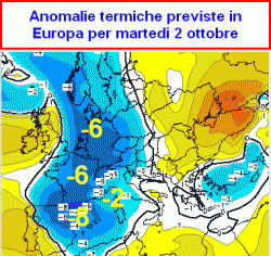 Nella giornata di martedi 2 ottobre (seconda mappa) parte dell’aria fredda riuscirà a travasare verso le nostre regioni centro-settentrionali dove avremo lievi scostamenti dalla media.