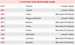 Nel secondo caso, ovvero a cavallo tra febbraio e marzo, si potranno raggiungere anche i 20 gradi. Città come Torino, Reggio Emilia e Modena al nord, Teramo al centro e Catania al sud vengono indicate dai nostri modelli quali favorite. Lo vediamo dalla tabella qui a fianco allegata e che potete consultare in via integrale a questo indirizzo https://www.meteolive.it/classifiche-meteo/.