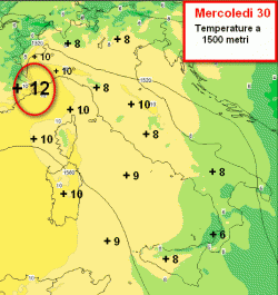 Questa cartina riassume le temperature a 1500 metri di altezza (all’incirca) che saranno presenti in Italia nella giornata di mercoledì 30 gennaio.