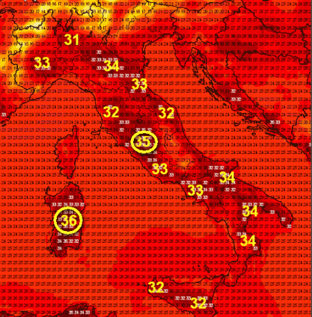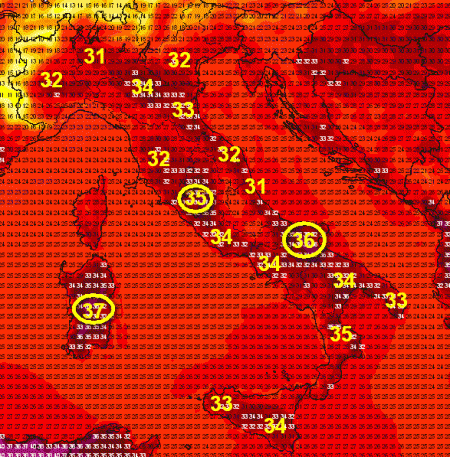 In evidenza i 37° delle zone interne della Sardegna; 36° sul Foggiano; 35° nelle pianure interne tosco-laziali e sulla Calabria Ionica.