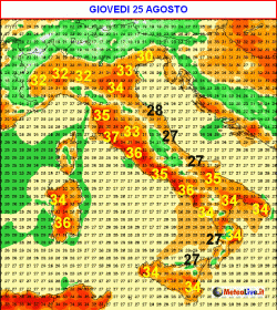 Giovedì 25 agosto (seconda mappa) avremo un generale incremento delle temperature rispetto alle giornate precedenti.