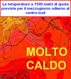 La cartina valida per il mezzogiorno di oggi è assai eloquente e ci mostra un sud Italia completamente avvolto dal colore rosso. A 1500 metri di quota le termiche oscilleranno tra + 23° e + 25° che in caso di eventi compressivi, possono portare valori attorno a 38-40° a livello del suolo.