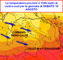 Già nella giornata di Ferragosto i venti meno caldi di provenienza occidentale si faranno sentire sulla Sardegna e sui settori di ponente. La calura sarà confinata sempre più a sud e nella giornata di sabato 16 ( di cui si riferisce la seconda cartina) ritroveremo valori decisamente più gentili su quasi tutto il centro-sud.