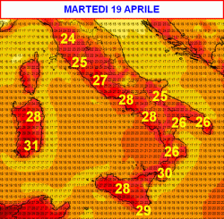 La seconda mappa ci mostra i picchi termici che si avranno al centro-sud nel pomeriggio si martedì 19 aprile.