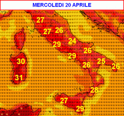 Ecco infine la temperature previste per la giornata di mercoledì 20, sempre al centro-sud.