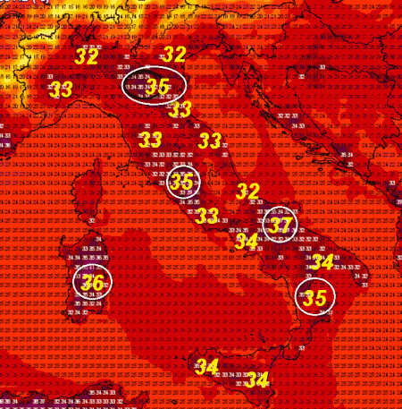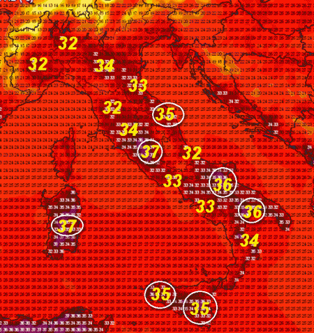Abbiamo opportunamente cerchiato in bianco le temperature superiori a 35°. In evidenza i 37° del Tavoliere delle Puglie, i 36° delle aree interne della Sardegna e i 35° della pianura emiliana, delle pianure tosco-laziali e della Calabria Ionica.