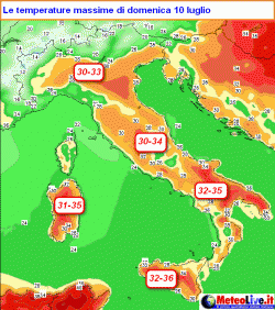 Il pomeriggio di oggi, domenica 10 luglio, sarà perciò decisamente caldo su tutte le regioni. Si avranno punte fino a 36 gradi nelle zone interne del sud, 35 sulle Isole Maggiori, 34 sulle zone interne del centro e 33 sui settori padani.