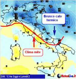 Lo stesso dicasi per il sud, settore d’Italia che trascorrerà ancora alcune giornate miti. Qui il raffreddamento non arriverà prima di giovedì e, inoltre escluderà i settori estremi, posti a favore di un mite Scirocco. Per un quadro termico generale e completo previsto per i prossimi sette giorni ecco la pagina appositamente predisposta .https://www.meteolive.it/speciali/MAPPE/73/Differenze-di-temperatura-al-suolo-dei-prossimi-giorni-rispetto-ad-oggi/32852/.