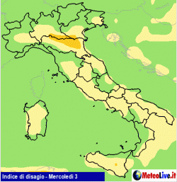 Le temperature infatti si porteranno appena al di sopra delle medie di riferimento stagionale e, con esse, potrà rinnovarsi qualche situazione di lieve disagio, così come evidenziato dalla nostra mappa.