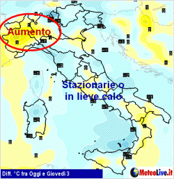 La prima mappa in alto ci mostra gli scarti di temperatura previsti dal nostro modello tra oggi (martedì 1° maggio) e la giornata di giovedì 3 maggio: si nota un aumento deciso al nord-ovest per un ritrovato soleggiamento, mentre sul resto dell’Italia la colonnina di mercurio permarrà su valori stabili, o al più, in lieve locale flessione per l’esaurimento dei venti meridionali. Per una panoramica completa della settimana potete consultare l’apposita pagina https://www.meteolive.it/speciali/MAPPE/73/Differenze-di-temperatura-al-suolo-dei-prossimi-giorni-rispetto-ad-oggi/32852/.