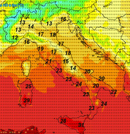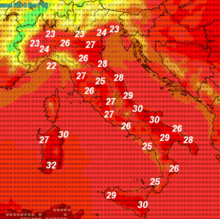 Punte di 32° sulla Sardegna meridionale e 30° su alcune aree dell’Italia meridionale. Notate anche i 26-27° ancora probabili sulle pianure del nord, specie tra est Lombardia, Emilia Romagna e Veneto.
