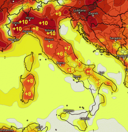 8-10° sopramedia al nord; circa 6-8° al centro, Sardegna compresa; tra i 4 e i 6° su Puglia, Lucania e Molise.