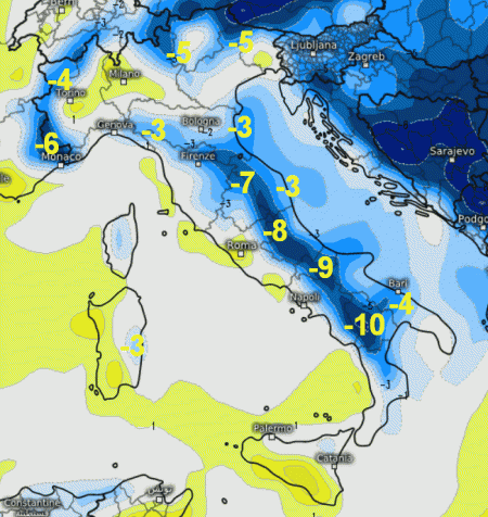 Punte di 8-10° sottomedia sull’Appennino centro-meridionale dove potrebbe nevicare sopra gli 800 metri. Al nord, le aree di pianura torneranno in media mentre i rilievi finiranno sottomedia anche di 5-6°.