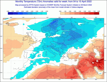 Aria più tiepida potrebbe farsi largo nella seconda decade di aprile grazie ad avvezioni calde nordafricane, contraddistinte dallo stesso modello inglese: nella settimana tra 11 e 17 aprile le temperature potrebbero salire sopra le medie del periodo di almeno 1-2°C.