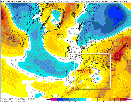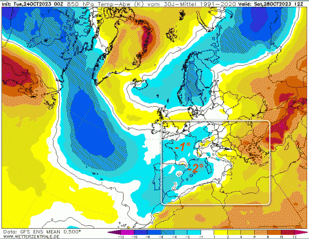 Ecco l’aria più fresca nord atlantica che dovrebbe far scendere le temperature sul Mediterraneo occidentale ed in parte anche sull’Italia. Compaiono zone ad anomalia lievemente negativa, compresa tra 1 e 2°, mentre dove vedete il colore bianco le temperature saranno in media.