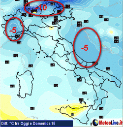 5° in meno si avranno sul nord-ovest ( Piemonte, in modo particolare) ed in Abruzzo. Le altre regioni sperimenteranno un calo termico minore, compreso tra 2 e 4°.