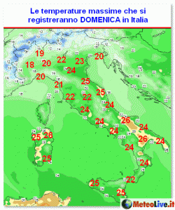 Spiccano i 26° previsti in Sardegna, nelle zone interne della Puglia e sulla Lucania. Molti i 24-25° in Sicilia, nelle pianure interne del Lazio, lungo il versante adriatico fino ad arrivare alla Romagna.