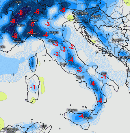 Come abbiamo già anticipato, al nord potrebbe fare addirittura freddo, soprattutto sotto i rovesci più consistenti; sul settore di nord-ovest si andrà tra i 5 e gli 8° sotto media. Sul resto d’Italia gli scarti termici al ribasso saranno più contenuti, ma egualmente presenti, fino a 4° in meno sulla Sicilia, la Calabria ed alcune zone dell’Appennino centrale.