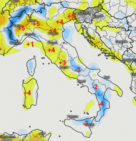 Per dare un’idea delle temperature che avremo domenica in Italia, ecco il quadro degli scostamenti termici rispetto alla media del periodo che avremo nella giornata in parola: