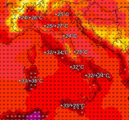 La Bora è un vento che porta temperature fresche e determina una riduzione nei tassi di umidità relativa. In pratica l’arrivo di questo vento segnerà il passaggio della perturbazione con un nuovo ricambio d’aria, le temperature si faranno più gradevoli al nord ed in parte sul centro Italia entro la festività domenicale. Ecco una stima delle temperature massime previste sull’Italia dal modello americano nel pomeriggio di domenica 12 luglio: