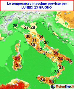 La prima cartina ci mostra il quadro delle temperature massime previste in Italia nella giornata di lunedì 23 giugno.