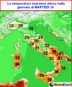 Queste invece sono le temperature massime attese in Italia per la giornata di martedì 24 giugno.