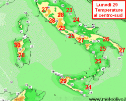 Temperature vicine ai 30° si prevedono su alcuni settori del versante tirrenico e sulle Isole.