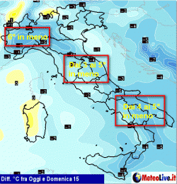 La cartina sopra riportata evidenzia il "salto" di temperatura che avremo da oggi a domenica sull’Italia.