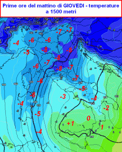 Sulla verticale del settentrione, le temperature a 1500 metri saranno comprese tra -4° del Piemonte e i -8° dell’Emilia Romagna.