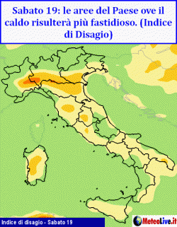 E saranno proprio le regioni settentrionali (con particolare riferimento alla Valpadana) i settori che più di altri subiranno le conseguenze "spiacevoli" del caldo. A partire da mercoledì 16 i valori termici andranno infatti aumentando gradualmente. Il picco verrà raggiunto tra venerdì 18 e sabato 19 quando il caldo potrebbe diventare intenso e fastidioso perche accompagnato da un alto tasso di umidità relativa. Condizioni MODERATE di caldo interesserebbero anche il Lazio, la Toscana, l’Umbria ed i settori interni della Sardegna.
