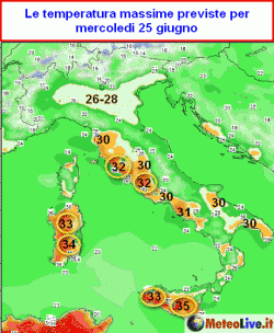 Queste invece sono le temperature massime attese in Italia per metà della settimana prossima ( siamo a mercoledì 25 giugno).