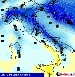 Osservate la cartina proposta in mappa e prevista per la giornata di giovedì 5 aprile prossimo: al nord le temperature caleranno fino a 10-13 gradi, al centro fino a 7-9 gradi, ma in Appennino sino a 10-12 gradi. Il sud, Appennino a parte, il raffreddamento sarà meno cattivo, ma i valori caleranno comunque anche fino a 5-6 gradi, qualcosina in meno in Sardegna.