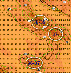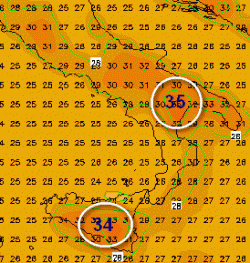 Alti valori, come indica la cartina, si prevedono anche nelle zone interne della Sicilia, dove il termometro arriverà probabilmente a 37°.
