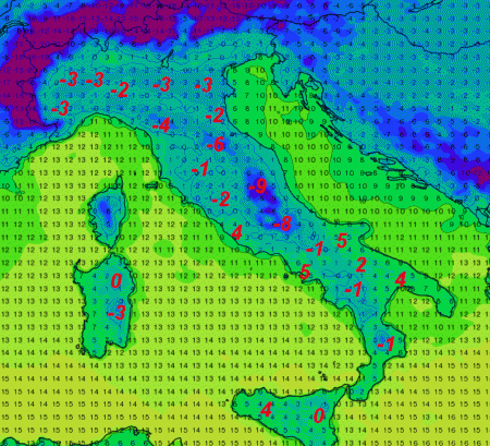 Freddo ovviamente anche al sud: sottozero le aree interne peninsulari con -1/-2°; 0° anche nella Sicilia interna, 4-5° lungo il litorale campano e pugliese.