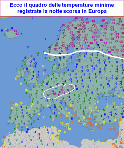 La mappa mostra le temperature registrate la notte scorsa in Europa e sulla vicina Russia; vi consigliamo di ingrandire l’immagine per avere un migliore riscontro visivo.