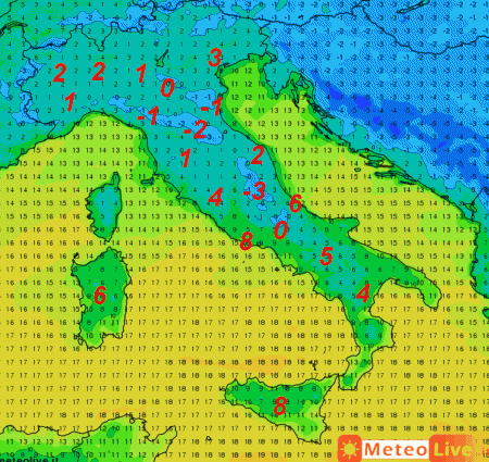 Valori al di sotto dello zero saranno possibili nelle aree interne appenniniche centro-settentrionali oltre ovviamente alle vallate alpine. Minime attorno allo zero si prevedono anche sulle pianure del nord e nelle aree interne dell’Italia centrale. Più elevati ovviamente i valori lungo i litorali, al sud e sulle Isole.