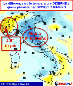 Questa cartina schematizza a grandi linee la differenza di temperatura che si avrà tra i valori che si registrano attualmente e quelli previsti per giovedì 2 maggio.