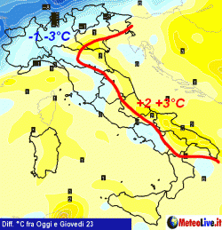Lungo il versante adriatico invece si assisterà ad un generale rialzo termico, soprattutto sui settori centro-meridionali, a causa dell’azione favonica prodotta dal venti di Garbino in caduta dai crinali appenninici. Qui il rialzo (temporaneo) sarà pari a +1 +3 gradi.
