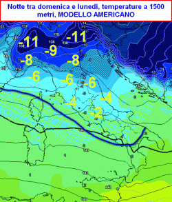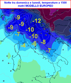 -11° a 1500 metri sulle alte pianure del nord, -8/-9° sulla verticale della Valpadana, -6° su Liguria e al centro fino alle Marche, tra -4° e -2° sulle restanti regioni centrali.