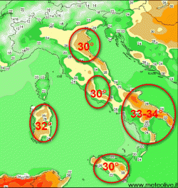 Come si può notare dalla cartina, valori di 33-34° sono previsti sulla Puglia, la Lucania ed il Molise. 32° nelle zone interne della Sardegna, 30-31° nelle zone interne del centro e sulle pianure del nord-est.