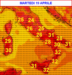 La prima mappa inquadra le temperature massime attese in Italia nella giornata di martedì 19 aprile.