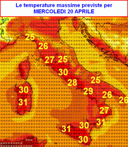 La seconda mappa ci mostra le temperature previste per le ore centrali di mercoledì 20 aprile.