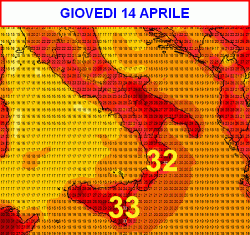 GIOVEDI 14 APRILE: la Sicilia sud-orientale rischierà i 33°, la Calabria Ionica i 32°. Si consiglia ovviamente di ingrandire l’immagine per avere un migliore riscontro visivo anche per ciò che concerne le temperature sulle altre regioni.